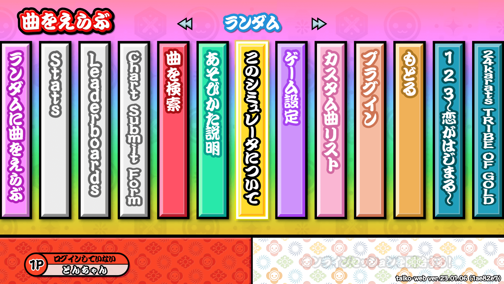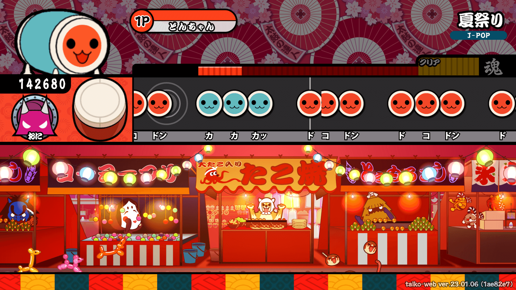 何も知らなかった自分は、「たぶん、太鼓さん次郎のweb版的な有志サイトだろう」と思って開いたら驚き。愛くるしいマスコットのドンちゃんや見覚えのある和風のUI、ゲーセンで聞き馴染みのある太鼓のSEなど、完全に公式のリソースで再現された本物と見分けのつかない太鼓の達人そのものが眼前に現れた。