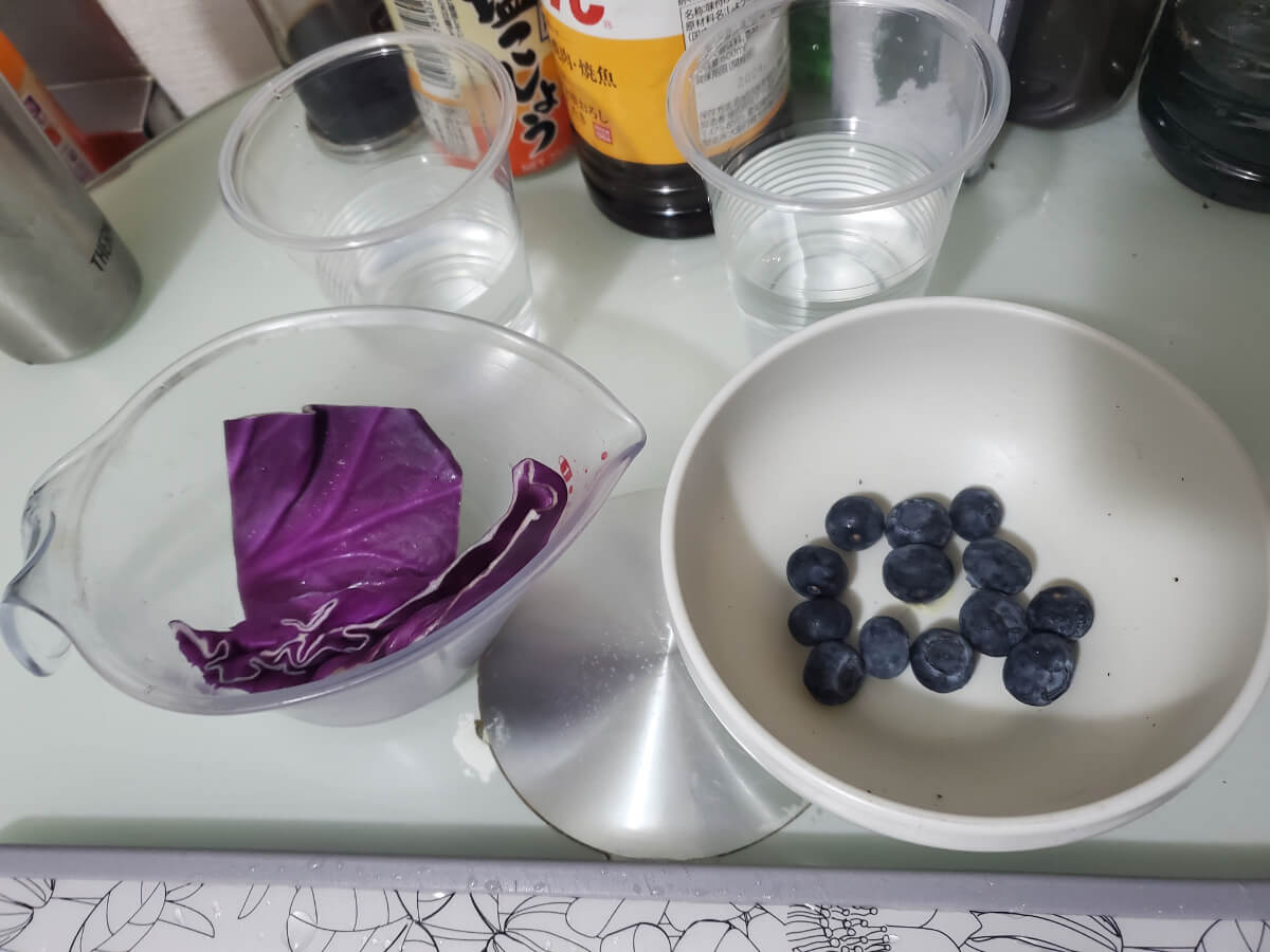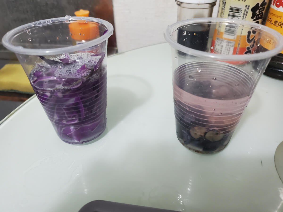 友人との闇鍋に向けて紫キャベツとブルーベリーの染力(そめりょく)を比較したいと思います。