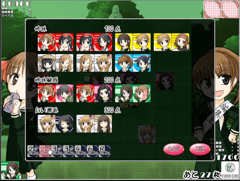 場に置かれたカードに自分のカードを加えて役を作り、得点を獲得する。先攻と後攻が順番にカードを置いて行き、山札がなくなった時点で得点が多かった方の勝利。1ターンの間に場に置いていいカードの数に制限がないため、手札全てを置くこともでき、場のカードが最も多い初手を取れるとリードが取りやすい。それでも後のカードの引き次第で負ける可能性は十分にあるため簡単にはいかないルールになっている。カードの置き方によって複数の役を同時に作り高得点を獲得できるため、閃きも大切な要素になっている。由乃と菜々の役がカード2枚で1000点の高得点役のためオススメ。