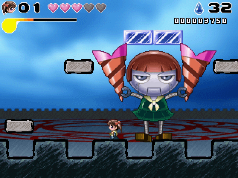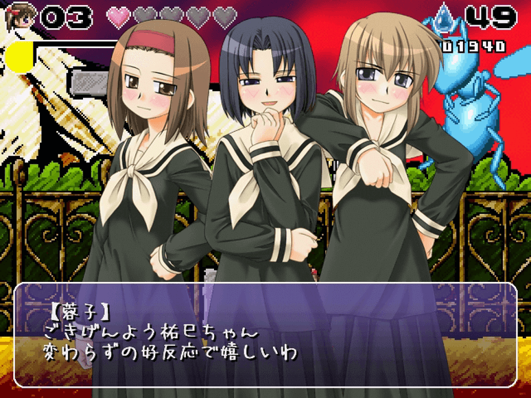 由乃:移動速度が早く攻撃力も高いが、リーチが短くジャンプ力が低いピーキーな性能。ステージの探索よりも強力な敵を倒す時に役に立つ。攻撃は竹刀の三段斬り、超必殺技は画面上の敵に大ダメージを与える「見様見真似天翔龍閃」。