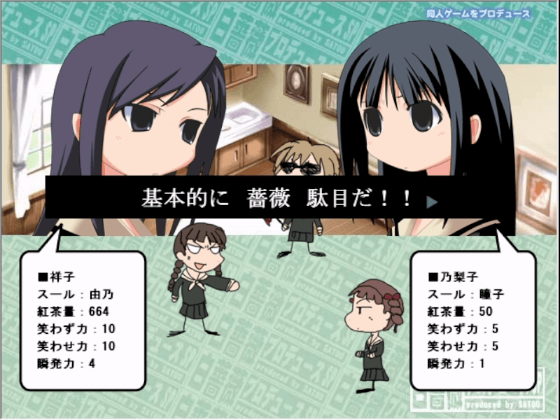 単語をランダムに組み合わせたギャグ(攻撃)で相手を笑わせ、口に含んだ紅茶(体力)をすべて吐き出させられれば勝ちとなる。バトルは全自動で行われるため運で勝敗が決定する。順調に進めば5分足らずで終わるボリューム。アニメーションやイラストが可愛らしく見応えあり。