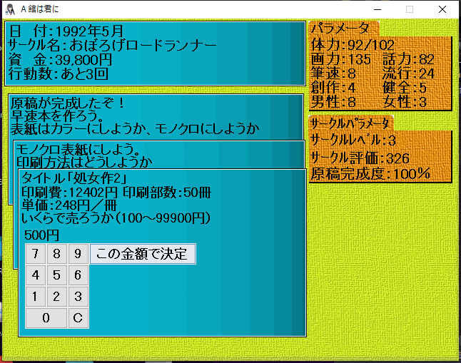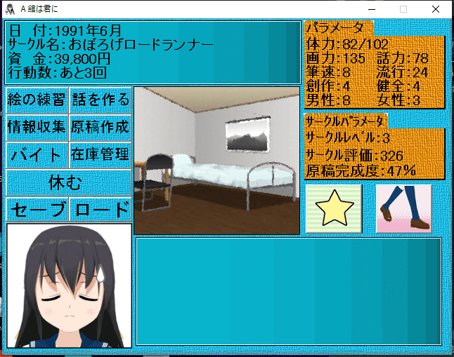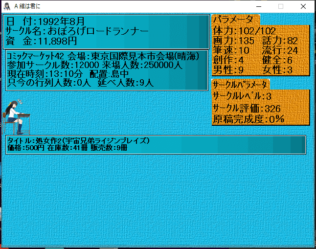 絵・プロットの練習、原稿作業、メンタル管理など様々なパラメーターをうまく調整しながら同人作家として大成を目指すゲーム。