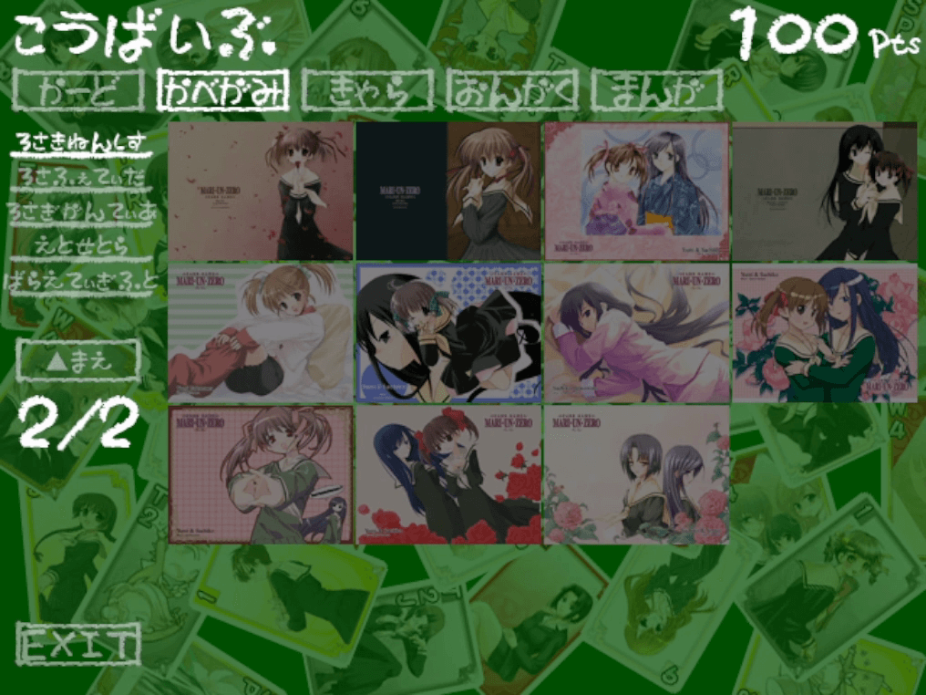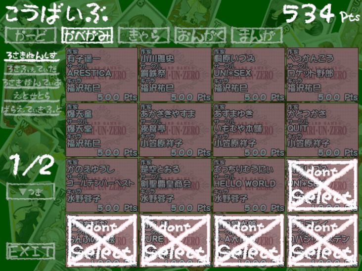 購買部ではストーリーやフリープレイで獲得したポイントでカードイラスト、壁紙、漫画、キャラクターを解放することができる。すべての要素を開放するには20万ポイント以上必要で、1プレイで獲得できるのは30~50ポイントほど。かなりの時間がかかる。