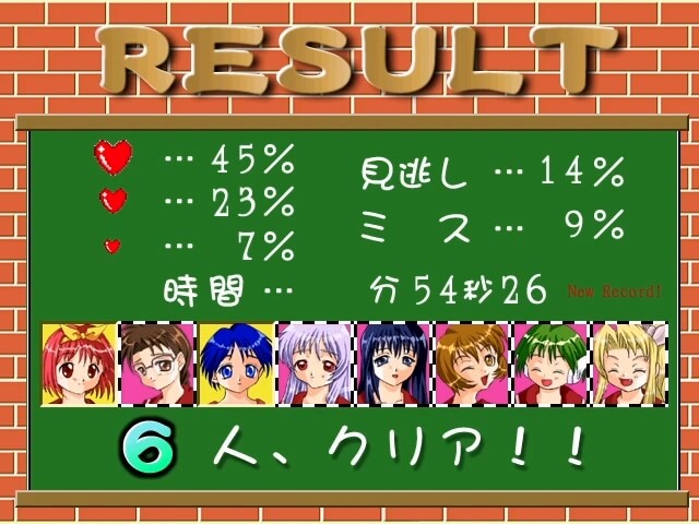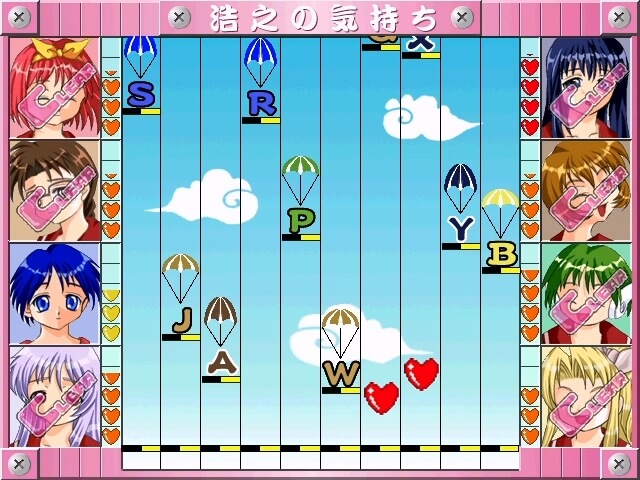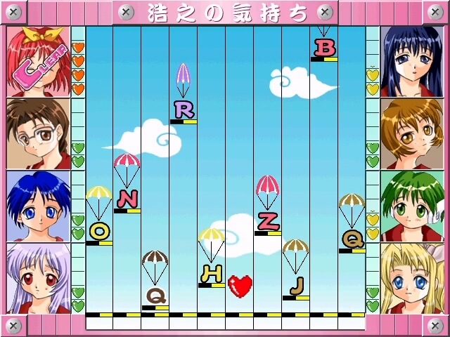 一見beatmania打!!っぽいゲーム。落ちてくる文字の色がそれぞれのキャラクターと対応しており、ベストタイミングでタイプすると対応したキャラの好感度があがる。誰か一人でもハートが5つ以上の状態になるとクリアとなる。